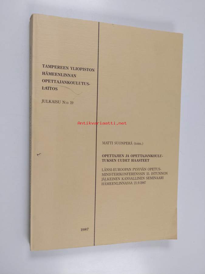Koko nimi: Opettajien ja opettajankoulutuksen uudet haasteet : Länsi-Euroopan pysyvän opetusministerikonferenssin 15. istunnon jälkeinen kansallinen seminaari Hämeenlinnassa 21.9.1987Muu(t) tekijä(t): Matti SuonperäSarja: Julkaisu / Tampereen yliopiston Hämeenlinnan opettajankoulutuslaitos n:o 19Asiasanat: koulutus, opettajat