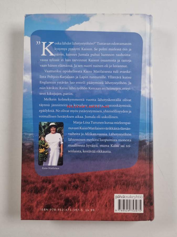 Muu(t) tekijä(t): Kaisu MatilainenMerkinnät: omistajamerkintä leikattu pois etulehden ylälaidastaAsiasanat: elämäkerrat, lähetystyöntekijät, lähetystyö