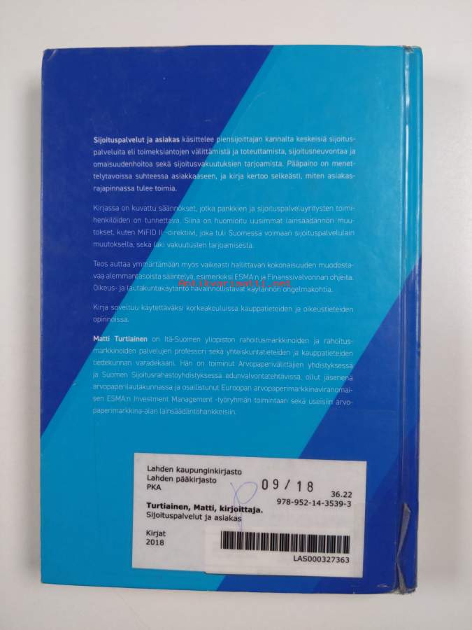 Merkinnät: omistajamerkintä (leima)Sarja: PraktikaAsiasanat: markkinointi, lainsäädäntö, rahoitusmarkkinat, asiakaspalvelu, arvopaperimarkkinat, sijoitustoiminta, oikeudellinen sääntely, valvonta, asiakastyö, tiedonantovelvollisuus, sijoituspalvelut