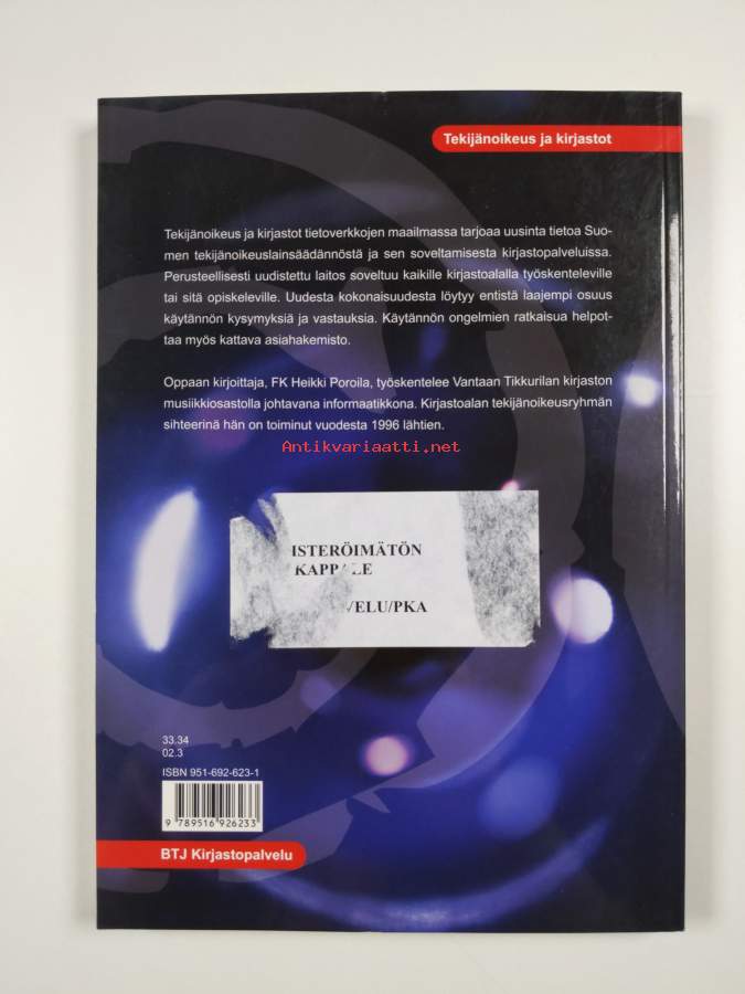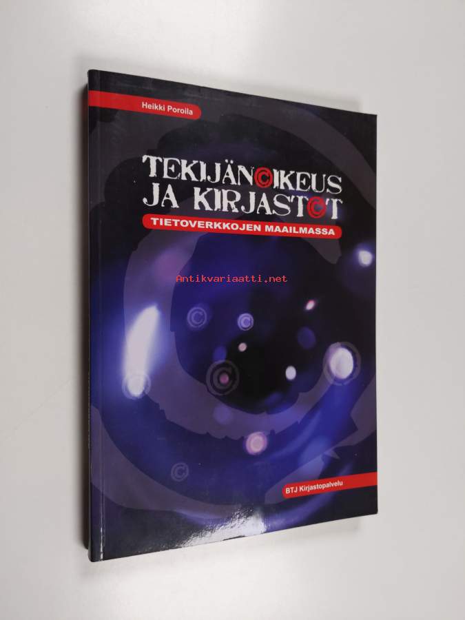Asiasanat: lainsäädäntö, tekijänoikeus, kirjastot, tietoverkot, verkkojulkaiseminen, sähköinen julkaisutoiminta, bibliotek, lagstiftning, datanät, upphovsrätt, elektronisk publicering, webbpublicering