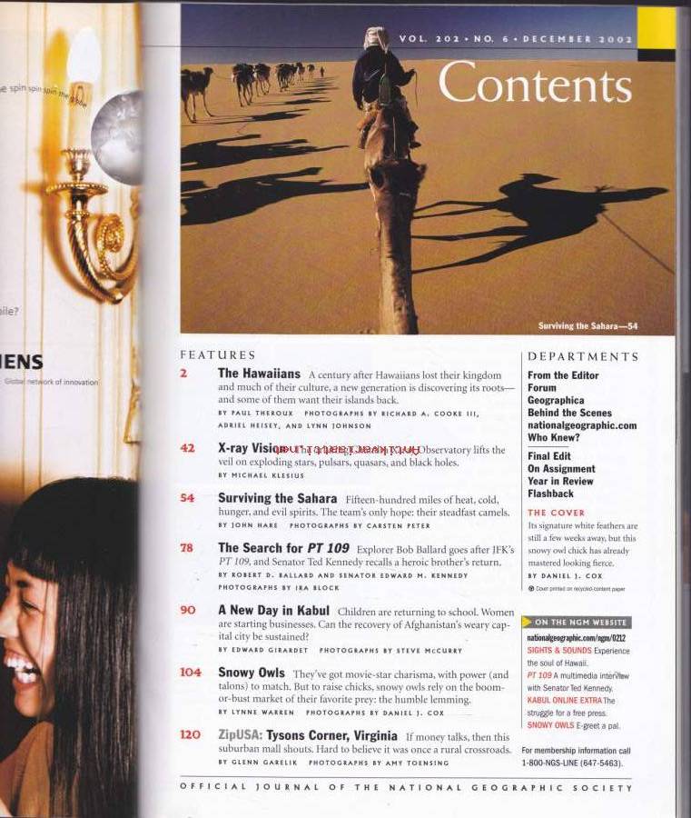 National Geographic - December 2002. The Magic of Snowy Owls. By Camel Across The Sahara