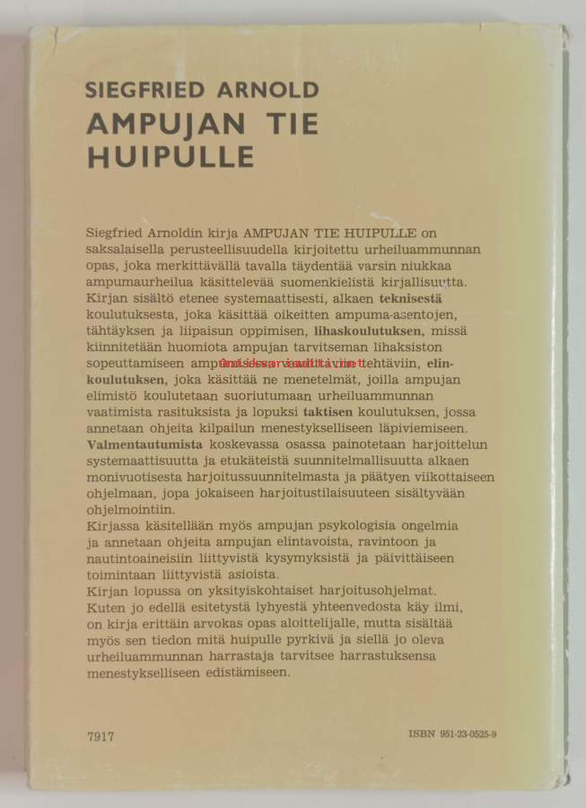 Urheiluammunnan opas, joka käsittelee ammunnan eri koulutus osa-alueita ja sisältää yksityskohtaisia harjoitusohjelmia. Arvokas tiedonlähde aloittelijalle ja harrastuksensa menestyksen edistämiseen sekä huipputasolle tähtäävälle. Dimensiot: 21 x 15 cm. Kuvitettu.