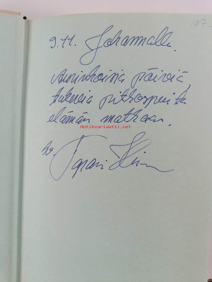 Hyvä. Hieman kolhua kansissa, selkämyksessä aavistus vinoutta. Kansipaperin kunto: pientä kulumaa / tekijän signeeraama omiste