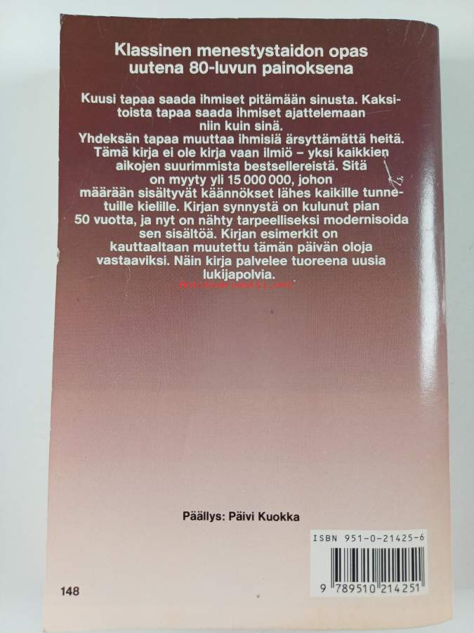 Muu(t) tekijä(t): Risto Mäenpää, Dorothy Carnegie ym.Alkuteos: How to win friends and influence peopleAsiasanat: ihmissuhteet, positiivisuus, vaikuttaminen, sosiaaliset taidot