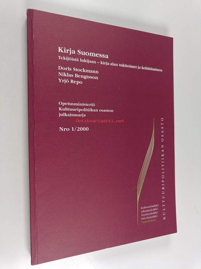 Muu(t) tekijä(t): Niklas Bengtsson, Yrjö RepoSarja: Julkaisusarja / Opetusministeriö. Kulttuuripolitiikan osasto 1/2000; Kulttuuripolitiikan osaston julkaisusarja / Opetusministeriö 2000, nro 1; Opetusministeriö. Kulttuuripolitiikan osaston julkaisusarja 1; Kulttuuripolitiikan osaston julkaisusarja / Opetusministeriö nro 1/2000Asiasanat: kirjailijat, kuluttajakäyttäytyminen, kustannustoiminta, koulutus, tukimuodot, kirjallisuus, tulevaisuus, myynti, kirjat, kirjastot, tietoverkot, kirja-ala, kustantajat, lukeminen, kirjakaupat, julkaisutoiminta, kirjatuotanto, lukemistutkimus, kirjakauppa, publishing, publishers, Books, kustannustoimi, Book trade