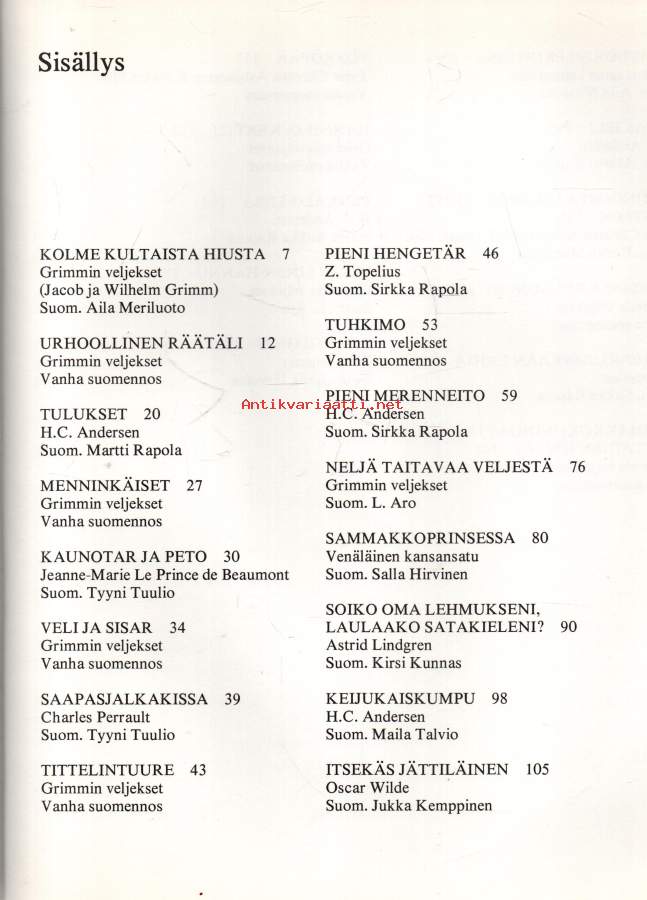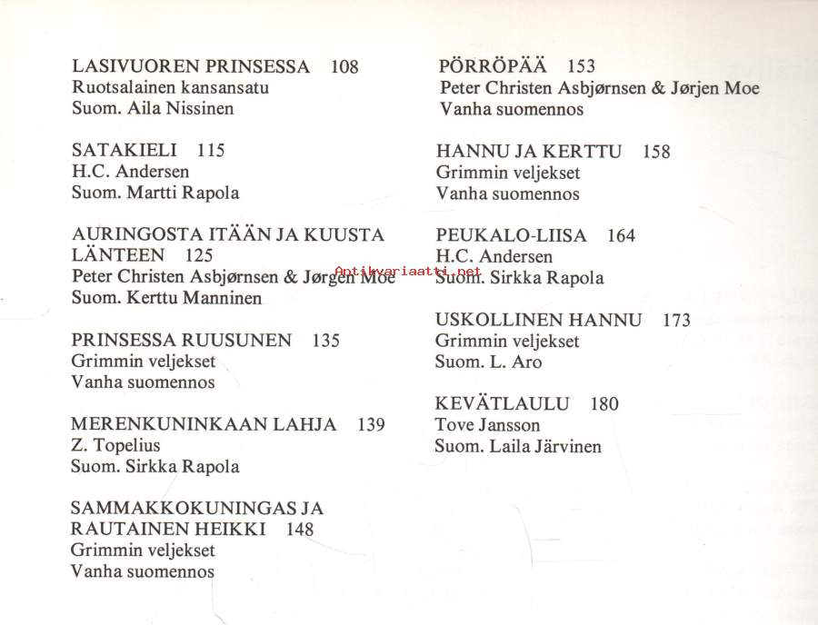 Saapasjalkakissa, Tittelintuure, Tuhkimo, Pieni Merenneito, Prinsessa Ruusunen, Hannu ja Kerttu, Peukalo-Liisa, H.C. Andersen, Grimmin veljekset, Tove Jansson, Z. Topelius, Astrid Lingren ym.