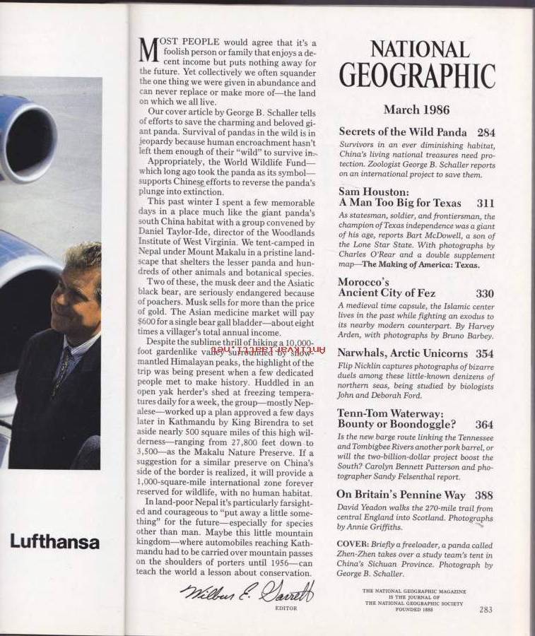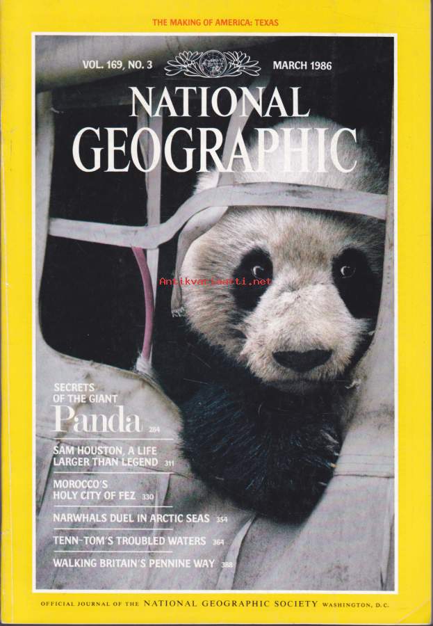 National Geographic - March 1986. Giant Pandas. Sam Houston. Fez. Narwhals. Tenn-Tom's Waterway. Walking Britain's Pennine Ways