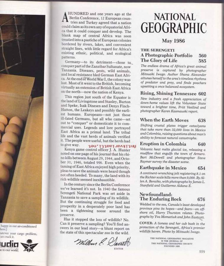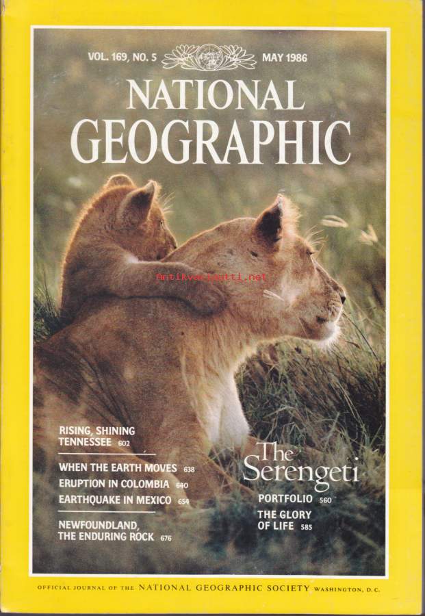 National Geographic - May 1986. Serengeti. Tennesee. Volcano. Earthquake. Newfoundland