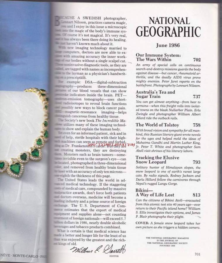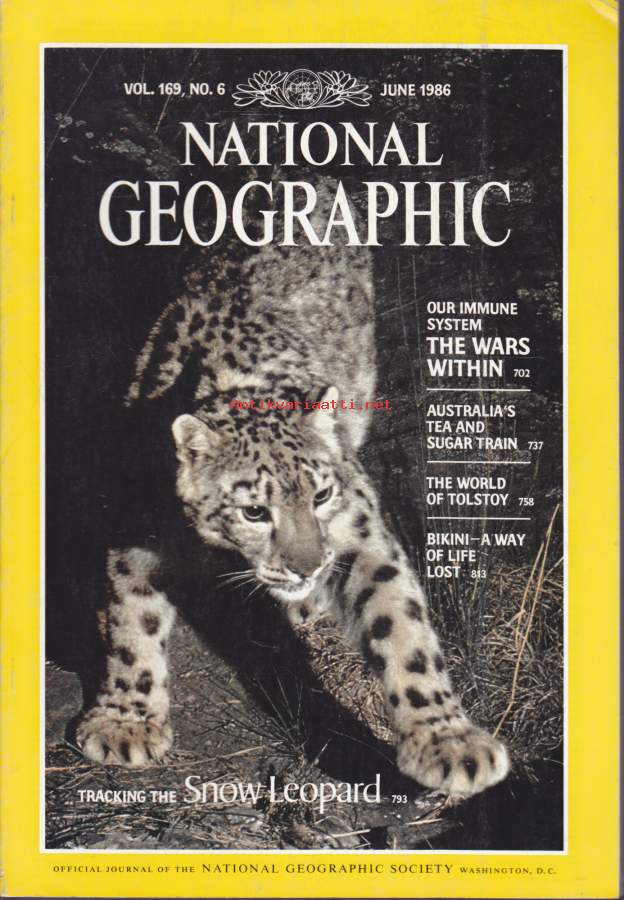 National Geographic - June 1986. Our Immune System. Tracking the Snow Leopard. Australia's Tea and Sugar Train. Tolstoy. Bikini.