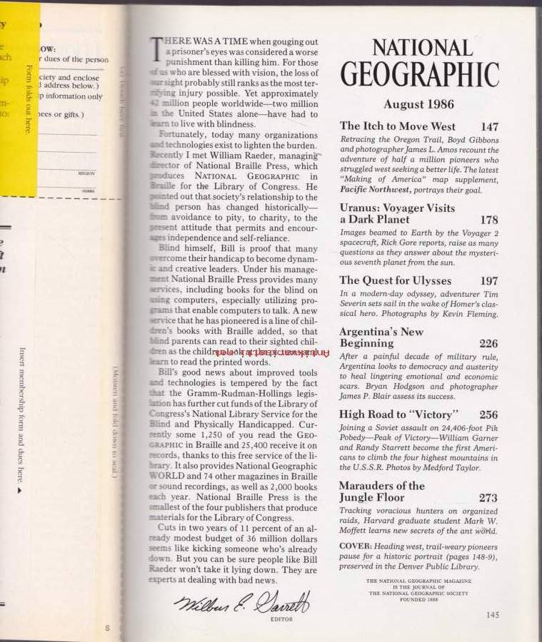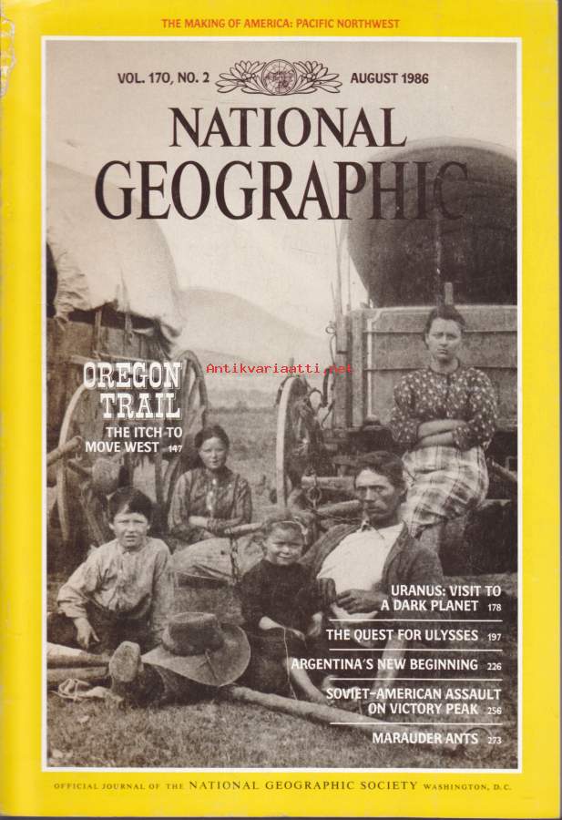 National Geographic - August 1986. Oregon Trail. Uranus. Ulysses. Argentina. "Victory Climb". Ants