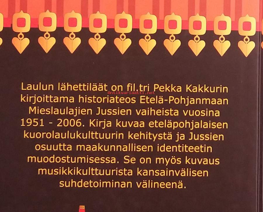 Teos käsittelee Seinäjoella toimivan Jussit-mieskuoron historiaa. Teos sisältää runsaasti valokuvia ja yksityiskohtaisia kuvauksia kuoron toiminnasta, tehden siitä arvokkaan lähteen sekä musiikin harrastajille että kulttuurihistoriasta kiinnostuneille. Dimensiot 25 ¤ 18 cm. Kuvitettu