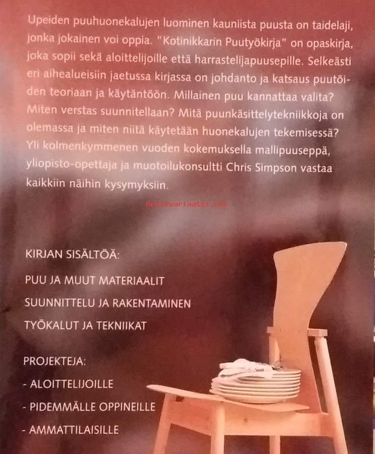 Kirjan sisältöä: Puu ja muut materiaalit, suunnittelu ja rakentaminen, työkalut ja tekniikat. Puunkäsittelymenetelmät, liitokset, pintakäsittely. Projekteja aloittelijoille ja ammattilaisille ( Huonekalut, koriste-esineet, käyttöesineet, leikkikalut )Kuvitettu.Dimensiot: 29*23cm