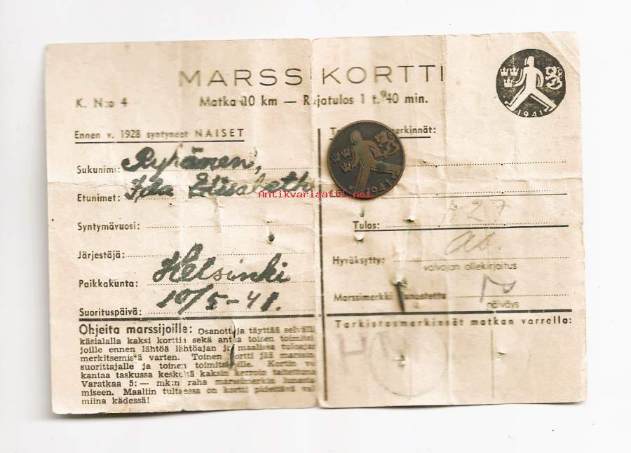 Marssikortti 1941 K N:o 4 ennen 1928 syntyneet naiset 10 km ja marssimerkki