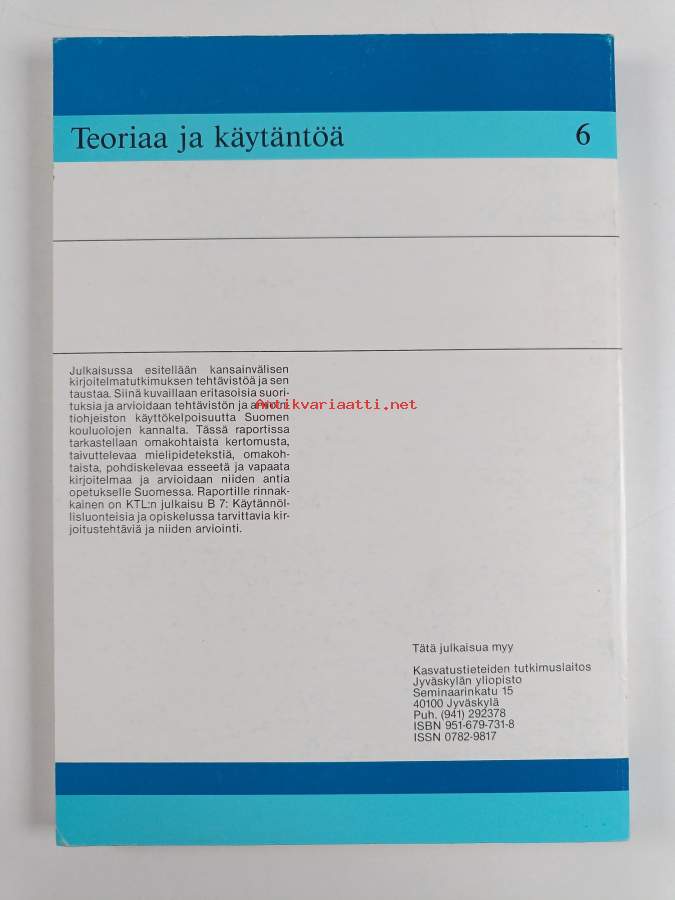 Koko nimi: Todellisuuden kuvaamista, pohdintaa ja arviointia edellyttäviä kirjoitustehtäviä ja niiden arviointi = Constructing and evaluating narrative, persuasive and reflective writing tasks and textsMuu(t) tekijä(t): Anneli VähäpassiSarja: Kasvatustieteiden tutkimuslaitoksen julkaisusarja. B, Teoriaa ja käytäntöä 6Asiasanat: kirjoittaminen, arviointi, esseet, kielenkäyttö, äidinkieli