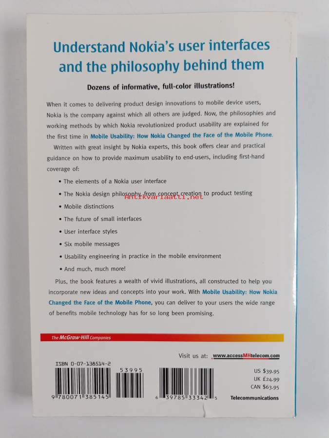 Muu(t) tekijä(t): Turkka Keinonen, Christian LindholmAsiasanat: Internet, palvelut, matkapuhelimet, tietoliikenne, tuotekehitys, käyttöliittymät, käytettävyys, service, Data communication, teleliikenne, Mobiilitekniikka, Mobile technology, Telecommunications, Cellular phones, User interfaces (Computer systems), Cell phones