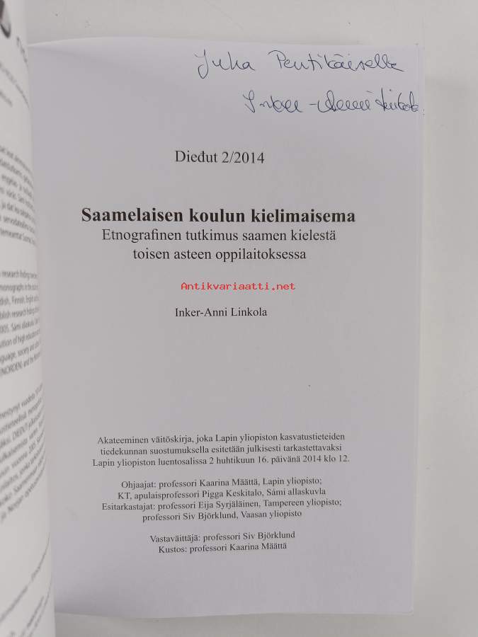 Diedut 2/2014 : saamelaisen koulun kielimaisema - etnografinen tutkielma saamen kielestä toisen asteen oppilaitoksessa (signeerattu, tekijän omiste)