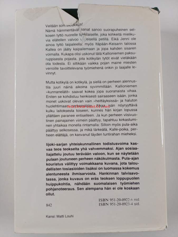 Hyvä. Hieman kulumaa, selkämyksessä aavistus vinoutta. Kansipaperin kunto: repeämiä/kulumaa