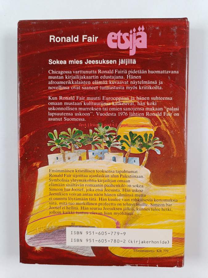 Etsijä / Ronald Fair. Asunut Suomessa 1976 saakka. Ensimmäisen kristillisen teoksensa hän sijoittaa Palestiinaan jossa sokea Simeon bar Josef etsii Jeesusta.