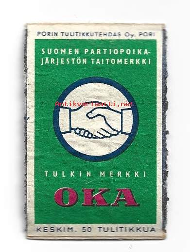 OKA Suomen Partiopoikajärjestön tulkin merkki- tulitikkuetiketti tulitikkuaskin vanerikansi