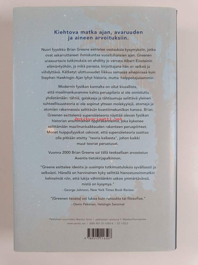 Muu(t) tekijä(t): Mikko VänttinenAlkuteos: The elegant universe : superstrings, hidden dimensions and the quest for the ultimate theoryAsiasanat: maailmankaikkeus, avaruus, mustat aukot, suhteellisuusteoria, kvanttimekaniikka, säieteoria