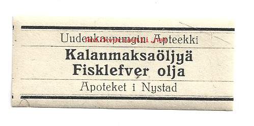 Uudenkaupungin Apteekki Uusikaupunki / Kalanmaksaöljy lääke-etiketti, apteekkietiketti etiketti
