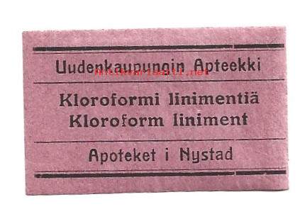 Uudenkaupungin Apteekki Uusikaupunki / Kloroformi linimentiä lääke-etiketti, apteekkietiketti etiketti