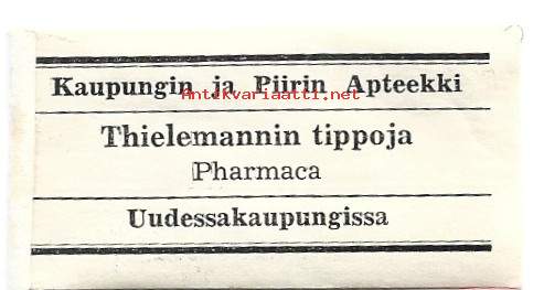 Kaupungin ja piirin apteekki Uusikaupunki / Thielemamannin tippoja lääke-etiketti, apteekkietiketti etiketti