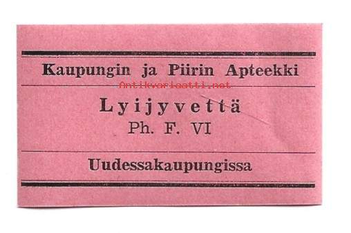 Kaupungin ja piirin apteekki Uusikaupunki / Lyijyvettä lääke-etiketti, apteekkietiketti etiketti