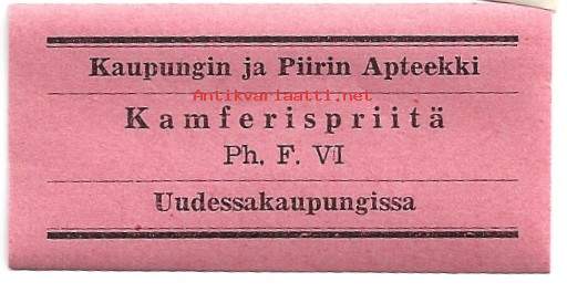 Kaupungin ja piirin apteekki Uusikaupunki / Kamferispriitä lääke-etiketti, apteekkietiketti etiketti