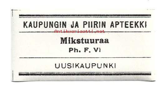 Kaupungin ja piirin apteekki Uusikaupunki / Mikstuuraa lääke-etiketti, apteekkietiketti etiketti