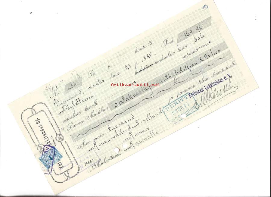 Kotimaan Lakkitehdas Oy Viipuri 1925 KOP - vekseli