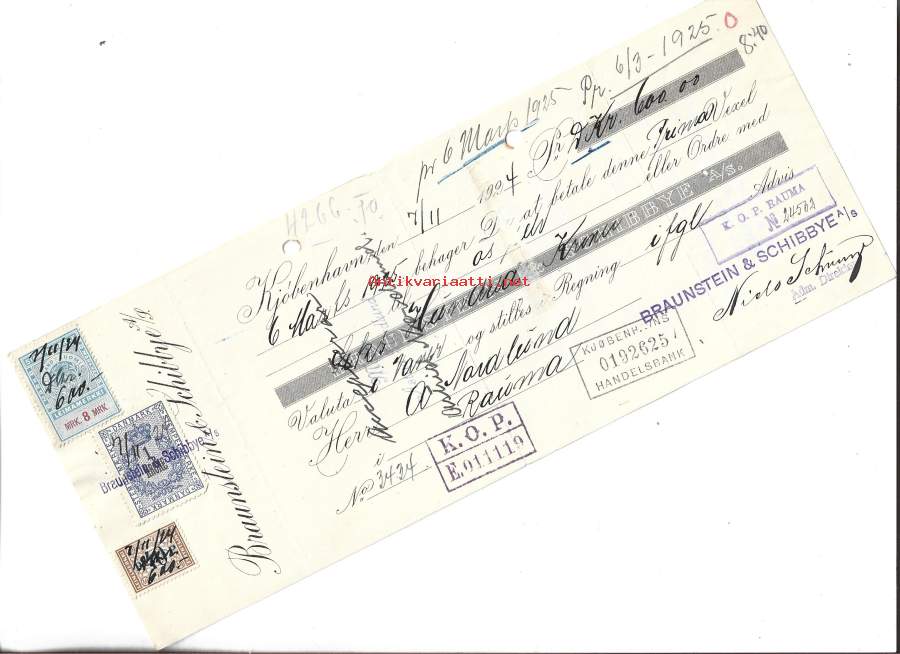 Braunstein & Schibbye Ab 1925 KOP / Köbenhamns Handelsbank - rauma vekseli