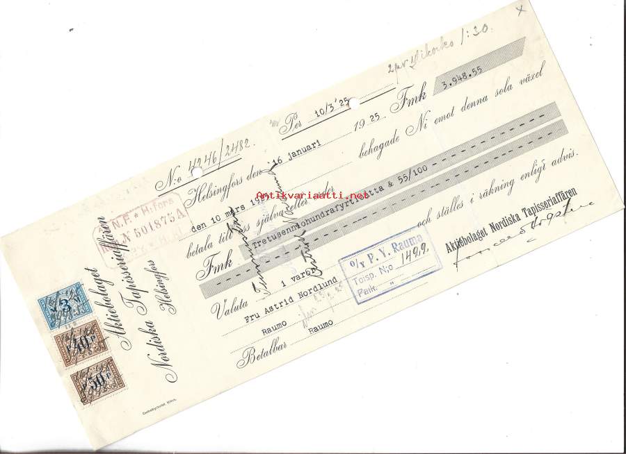 Nordiska Tapiesseriaffär Helsingfors 1925 Nordiska Föreingsbanken Rauma vekseli