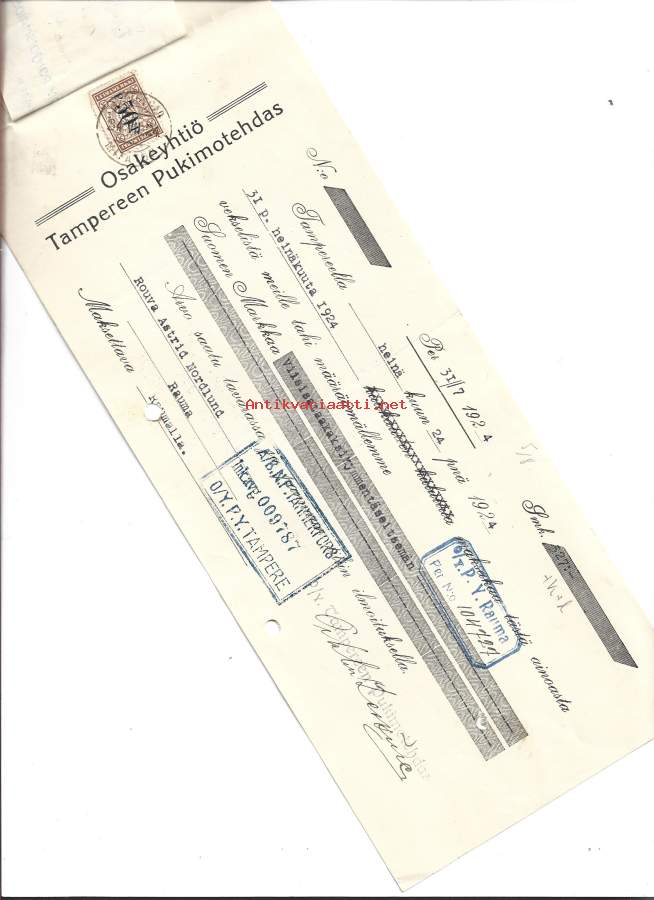 Tampereen Pukimotehdas Oy Tampere 1924 Rauma PY vekseli