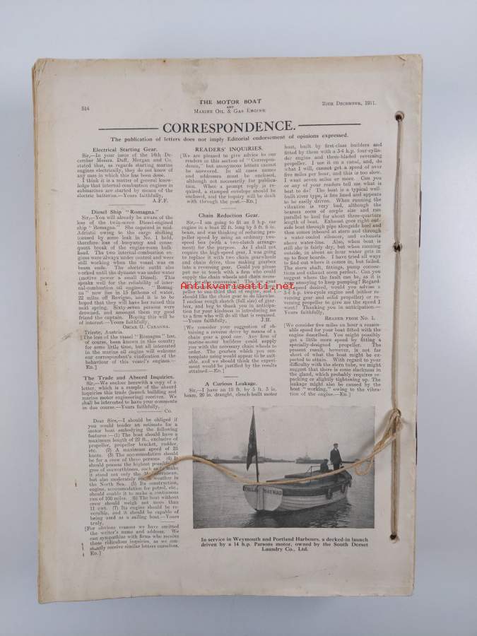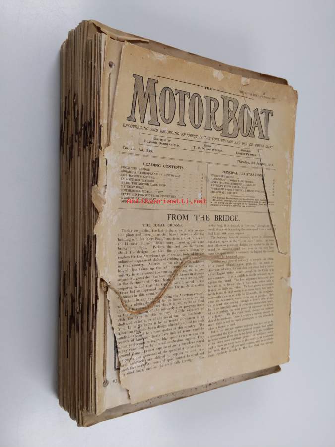 ensimmäisen lehden kannesta puuttuu pari palaa (toinen kulmapala tallella) ; parissa lehdessä puuttuu osa sivusta ; muutaman lehden kannessa hieman tahraisuutta ; harvinainen moottoriveneisiin keskittynyt lehti