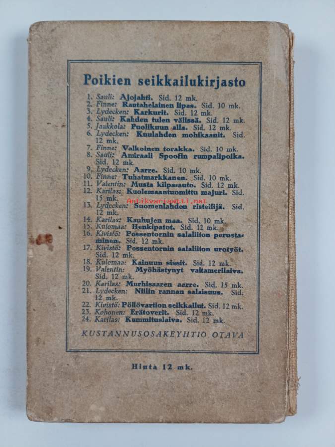 Huonokuntoinen (lukukelpoinen). Jonkin verran kulumaa, sidos löystynyt ja näkyvissä, muutamalla sivulla lyijykynämerkintöjä. selkämys puuttuu