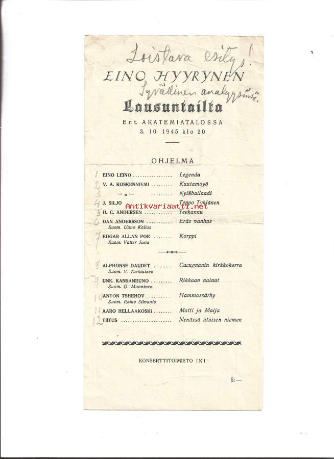 Eino Hyyrynen Lausuntailta Ent akatemiantalossa - käsiohjelma 1945