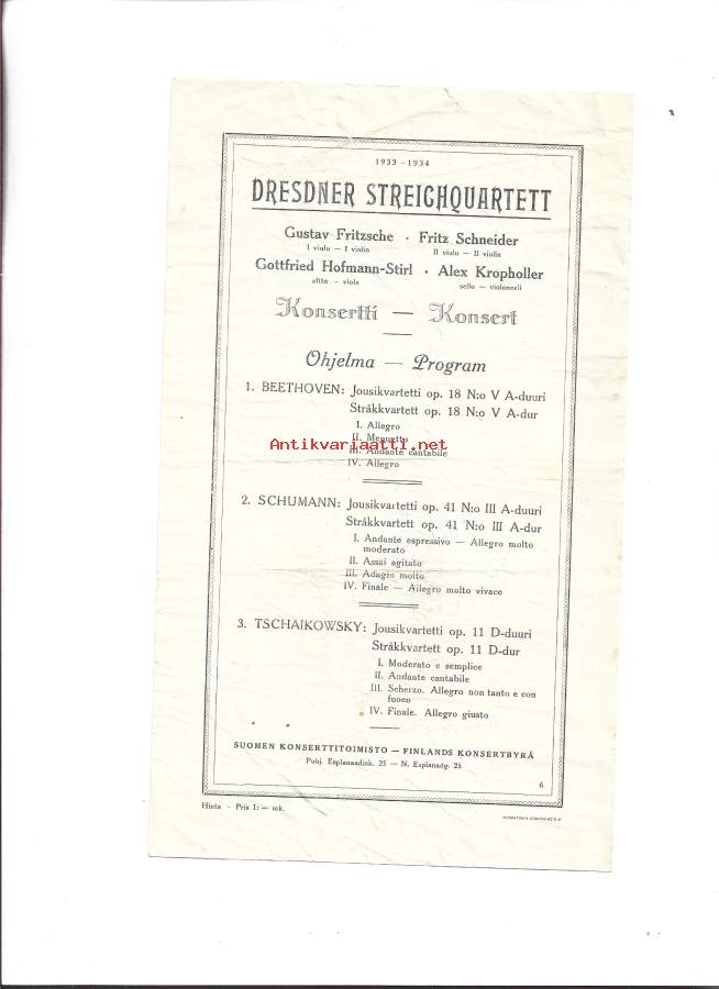 Dresdner Streichquartett Konserri 1933 - 34 - käsiohjelma