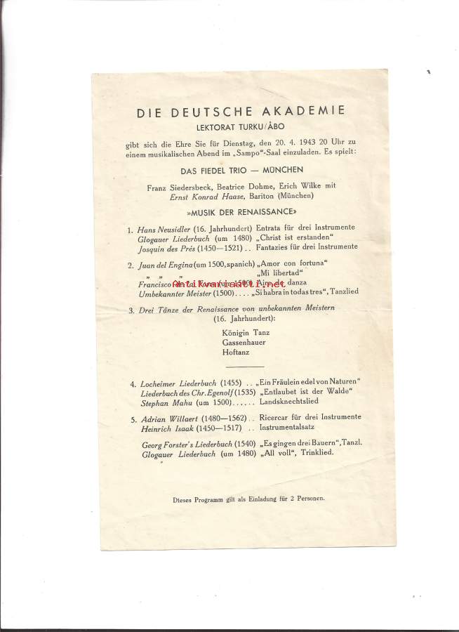 Die deutsche Akademie Lektorat Turku Muskalischen Abend in Sampo Saal 1943 - käsiohjelma