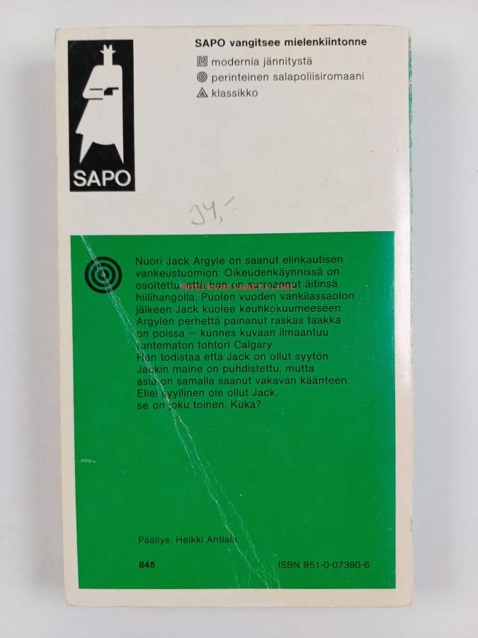 Syyttömyyden taakka, 1976. SAPO 191. Syyttömyyden taakan psykologinen asetelma on monisyinen. Motiiveja on usealla henkilöllä. Erinomainen dekkari.