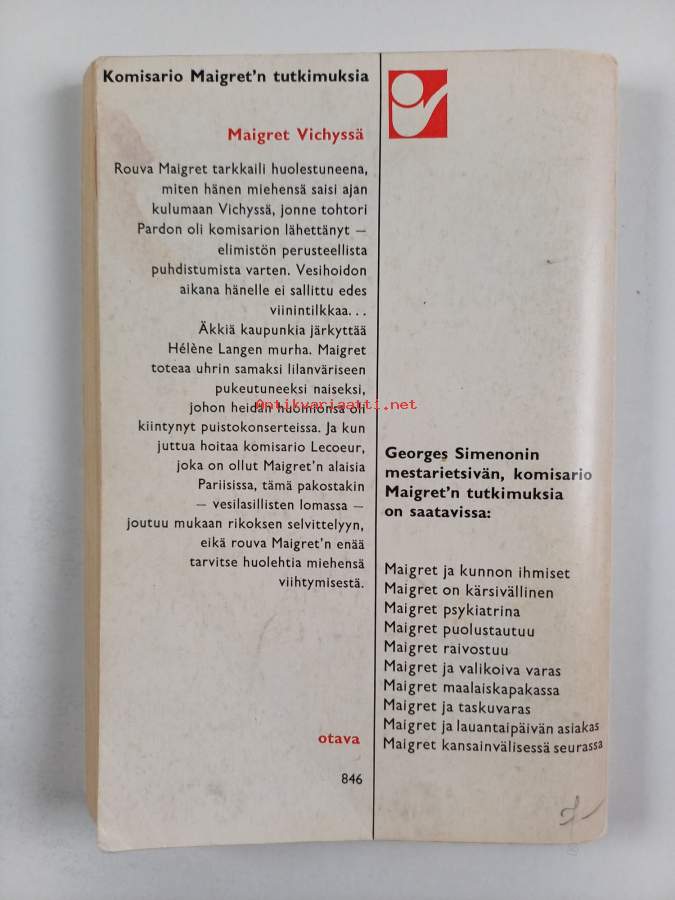 Muu(t) tekijä(t): Irmeli SallamoMerkinnät: omistajamerkintäSarja: Komisario Maigret'n tutkimuksiaAlkuteos: Maigret à VichyAsiasanat: salapoliisikirjallisuus