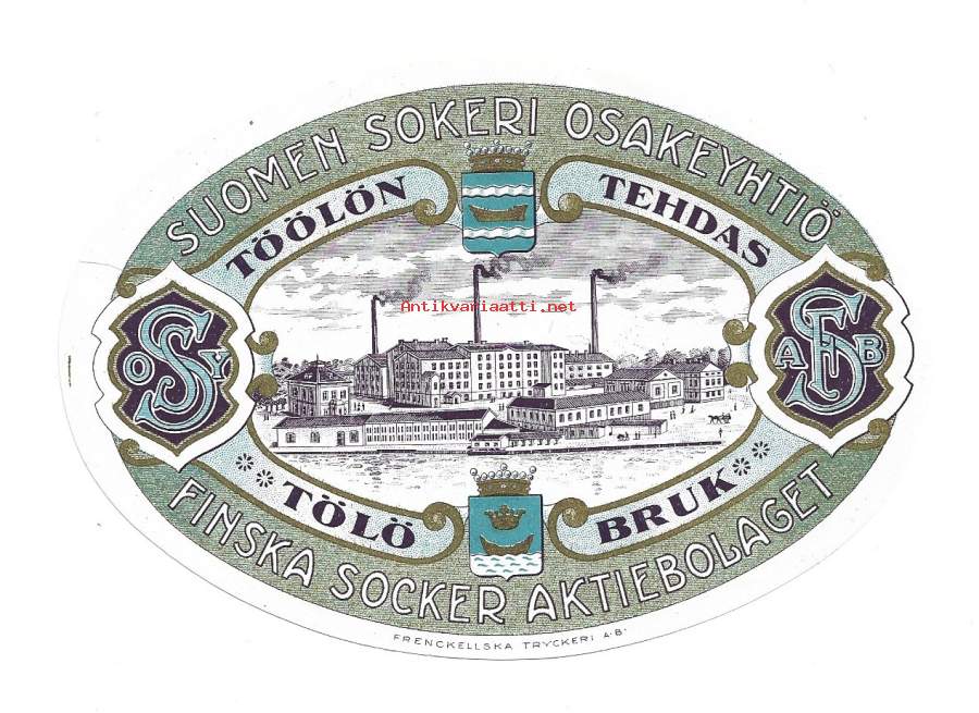 Suomen Sokeri Oy Töölön tehdas - tuote-etiketti Frenckell lito 10x14 cm