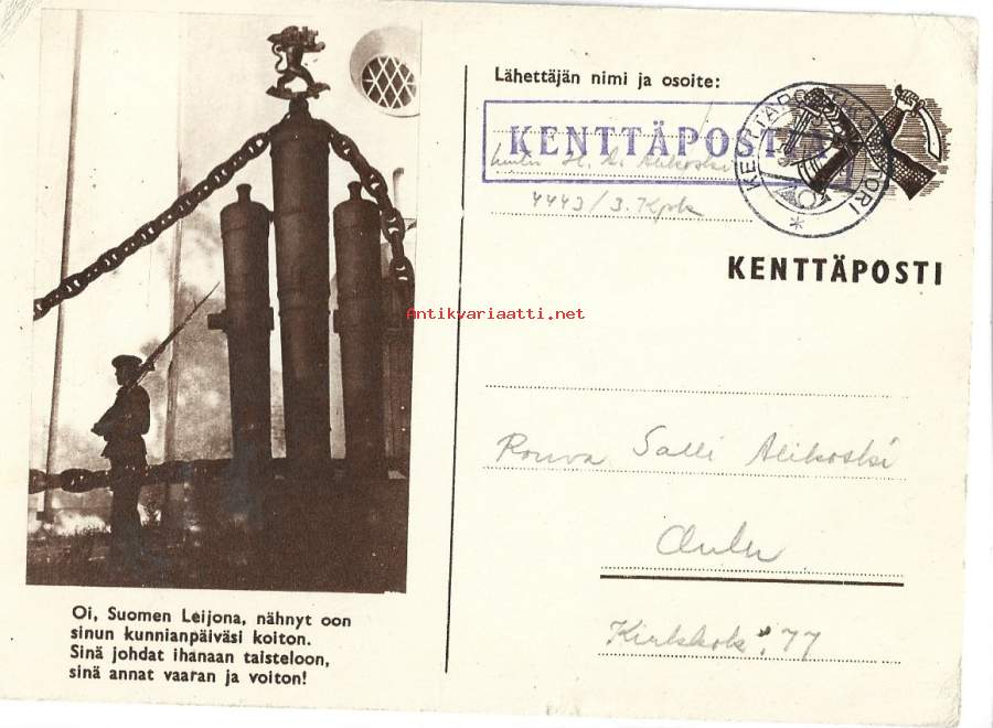 Oi Suomen Leijona ... - postikortti sotilaspostikortti sotilaskortti kenttäpostikortti Kenttäpostia kulkenut 1941