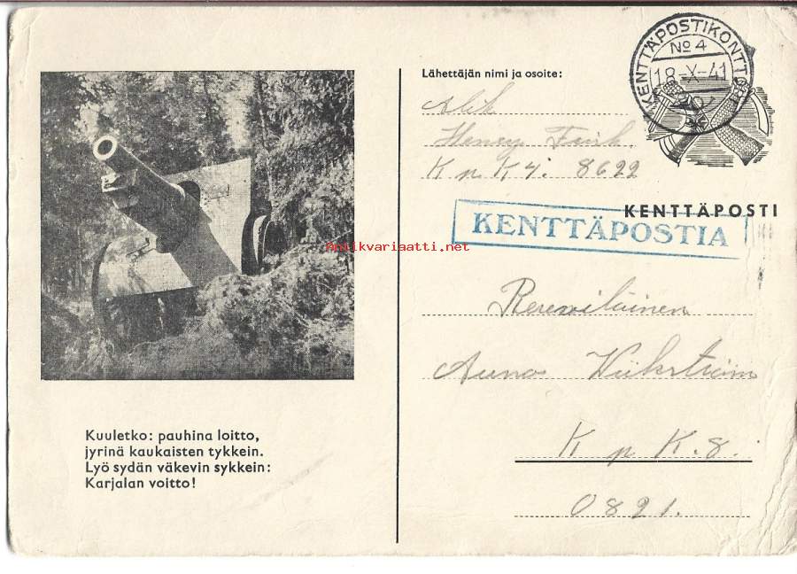 ..tykkien jylinä ... postikortti sotilaspostikortti sotilaskortti kenttäpostikortti Kenttäpostia kulkenut 1941