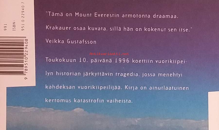 Omakohtainen kertomus kuvaa retkikunnan nousua Mont Everestin huipulle ja traagista paluumatkaa, jossa vain kaksi huipulle päässyttä selvisi hengissä. Dimensiot 22 ¤ 15 cm.