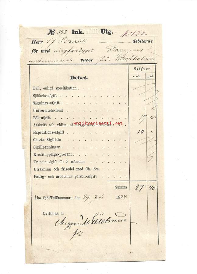 Herr Kapten Conradi Ångfartyy Dagmar Åbo Sjö-Tullkammare - kuitti Åbo . 1874 till Stockholm - firmalomake