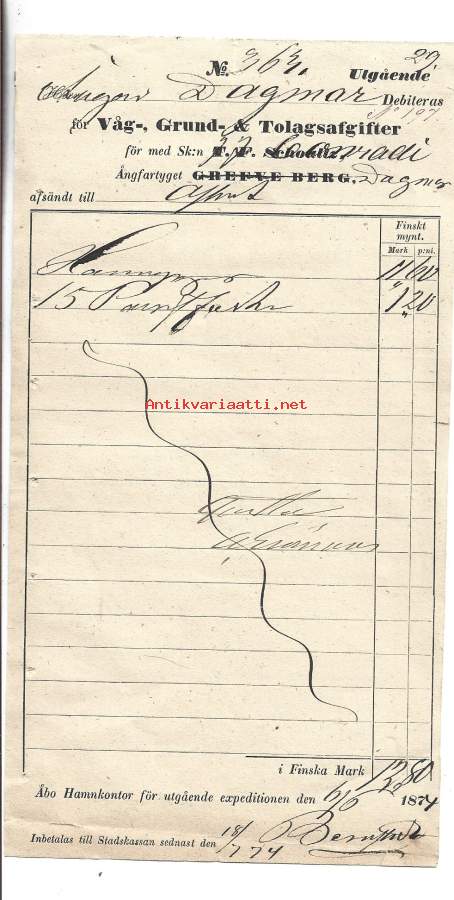 Åbo Hamnkontor - Våg., Grund- & Tolagsgifter 1874 - firmalomake