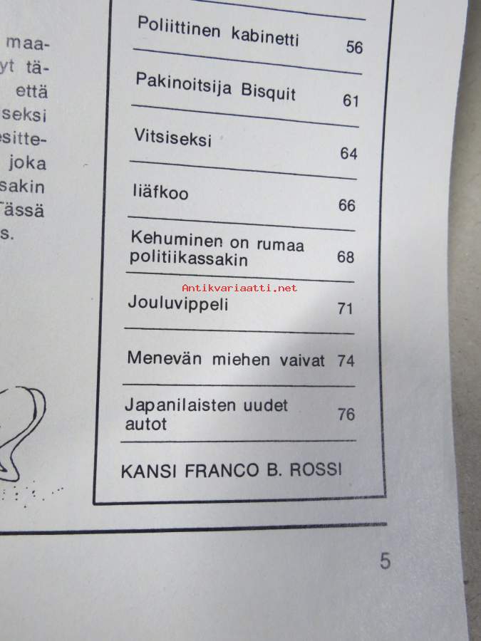 Vip 1971 nr 12, sis. mm. seur. artikkelit / kuvat / mainokset; Otettiin pienet joulut, Aarre Simosen muistelmat 1, Varusmiesten kuolemat lisääntyvät, Elämä alkaa Lamborghinista, Kuinka kauan maaherra Esko Kulovaara saa olla vielä virassaan - epäilyttäviä maakauppoja, suuruudenhulllu palatsisuunnitelma - valtion virastotalon rakennuttaminen sairaalan edelle?, Isojen poikien jouluvippeli -lautapeli, ym.