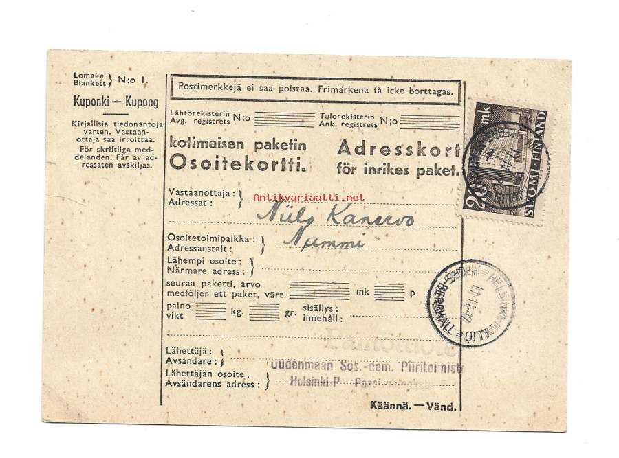 Kotimaisen paketin osoitekortti 1950 l blanko 3 kpl erä
