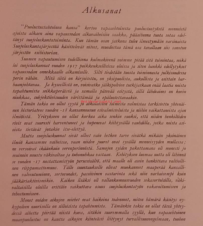 Historiikki on kuvaus suomalaisen vapaaehtoisen maanpuolustuksen synnystä ja kehityksestä. Teoksessa kuvataan, kuinka kansallinen yhtenäisyys, paikallinen aloitteellisuus ja isänmaallinen henki loivat pohjan Suojeluskuntien synnylle. Kuvitettu. Dimensiot 25 ¤ 18 cm.